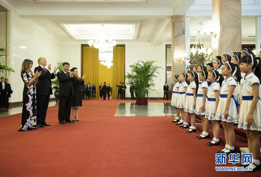 11月9日,國家主席習(xí)近平在北京人民大會堂東門外廣場舉行歡迎儀式,歡迎美利堅合眾國總統(tǒng)唐納德·特朗普對中國進行國事訪問。這是習(xí)近平和夫人彭麗媛同特朗普夫婦在人民大會堂欣賞文藝表演。新華社記者 李學(xué)仁 攝