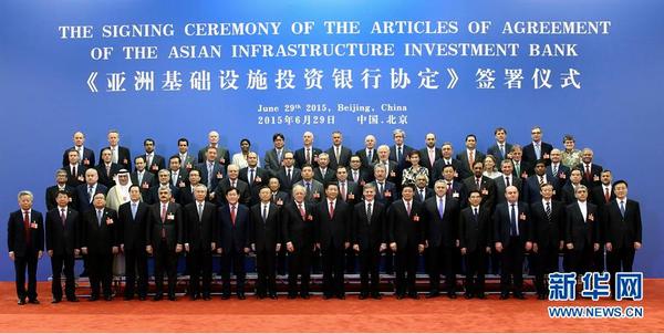 【正式成立】2015年12月25日,歷經(jīng)800余天籌備,由中國(guó)倡議成立、57國(guó)共同籌建的亞洲基礎(chǔ)設(shè)施投資銀行(亞投行)于當(dāng)日正式成立,全球迎來(lái)首個(gè)由中國(guó)倡議設(shè)立的多邊金融機(jī)構(gòu)。圖為2015年6月29日,國(guó)家主席習(xí)近平在北京人民大會(huì)堂會(huì)見(jiàn)出席《亞洲基礎(chǔ)設(shè)施投資銀行協(xié)定》簽署儀式的各國(guó)代表團(tuán)團(tuán)長(zhǎng)。