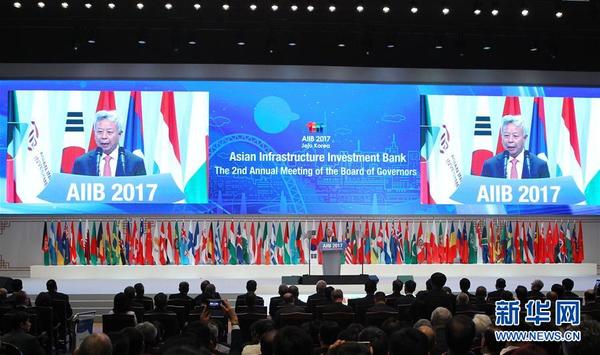 【第三次“吸粉”】2017年6月16日,亞投行宣布其理事會(huì)已批準(zhǔn)3個(gè)新意向成員加入,分別為阿根廷、馬達(dá)加斯加和湯加。至此,亞投行成員總數(shù)擴(kuò)至80個(gè)。圖為2017年6月16日,韓國(guó)濟(jì)州,亞投行第二屆年會(huì)開(kāi)幕式現(xiàn)場(chǎng)。
