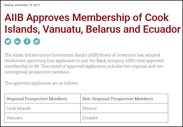 【第四次“擴(kuò)容”】2017年12月19日,亞投行宣布批準(zhǔn)庫(kù)克群島、瓦努阿圖、白俄羅斯和厄瓜多爾四個(gè)成員的加入申請(qǐng),成員增至84個(gè),這是亞投行自開(kāi)業(yè)以來(lái)的第四次“擴(kuò)容”。圖為亞投行官網(wǎng)截圖。(新華網(wǎng)國(guó)際頻道 徐海知)