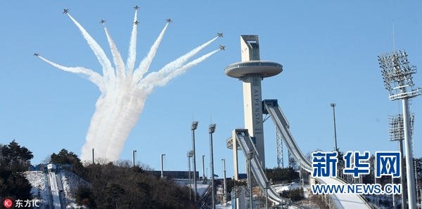 平昌冬奧會(huì)倒計(jì)時(shí)50天 韓黑鷹飛行隊(duì)在空中“畫(huà)”出奧運(yùn)五環(huán)(圖)