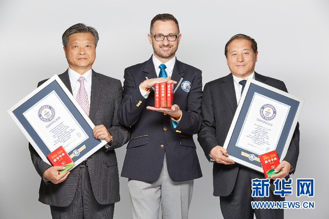 資料圖片:吉尼斯世界紀錄全球紀錄部門資深副總裁兼中國區(qū)總經理馬可(中)為《新華字典》頒發(fā)證書。(吉尼斯世界紀錄供圖)