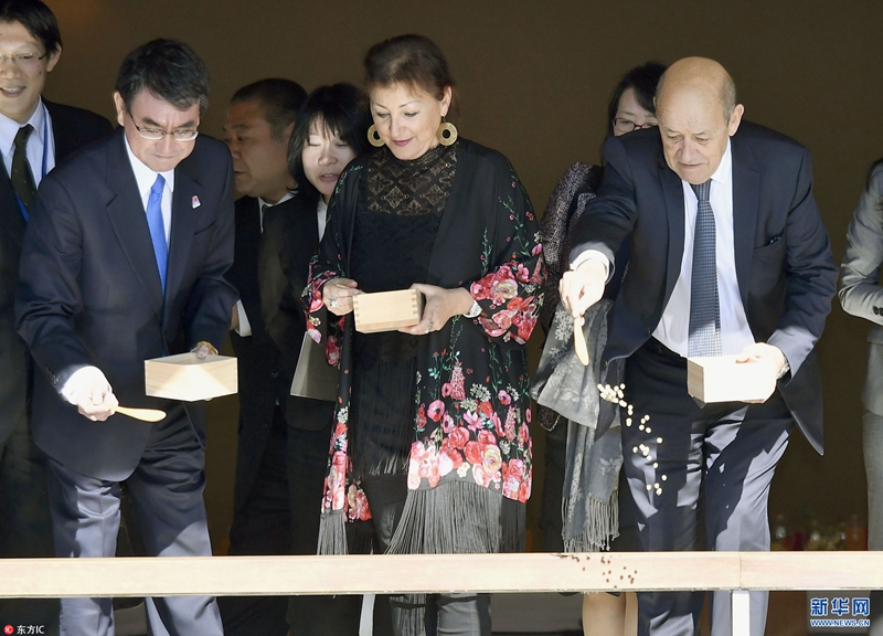 當(dāng)?shù)貢r(shí)間2018年1月27日,日本東京,日本外相河野太郎接待到訪的法國(guó)外長(zhǎng)讓·伊夫·勒德里昂及其夫人,帶其參觀赤坂宮,體驗(yàn)喂魚(yú)。(圖片來(lái)源:東方ic)