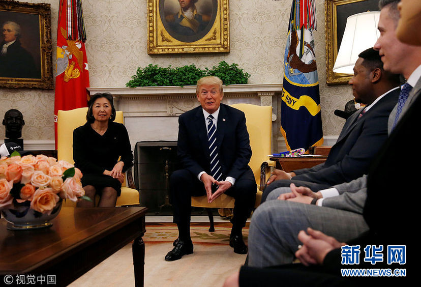 美國(guó)總統(tǒng)特朗普與公司職員討論稅改 獲贈(zèng)一雙花襪子