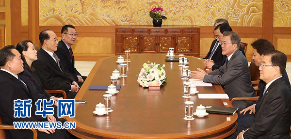 2月10日,在韓國首爾青瓦臺,韓國總統(tǒng)文在寅(右三)會(huì)見由朝鮮最高人民會(huì)議常任委員會(huì)委員長金永南(左三)率領(lǐng)的朝鮮高級別代表團(tuán)。新華社/紐西斯通訊社