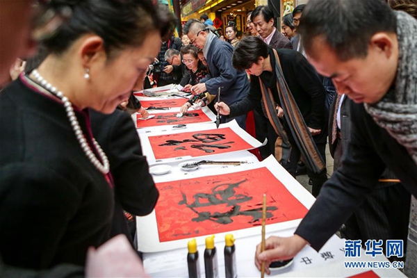 2月11日,在日本橫濱,書法家在活動現(xiàn)場寫“?!弊帧P氯A社記者馬曹冉攝