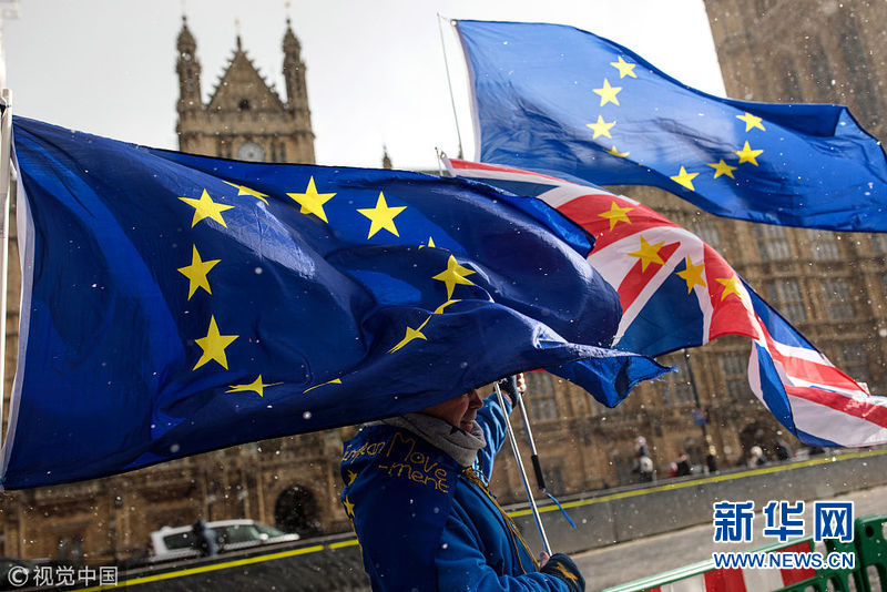 英國(guó)民眾議會(huì)外舉歐盟旗幟抗議“脫歐”