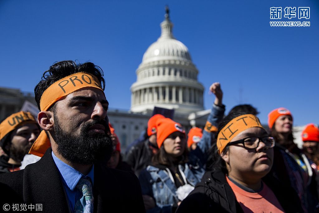 當(dāng)?shù)貢r(shí)間2018年3月5日,美國(guó)華盛頓,移民活動(dòng)家在國(guó)會(huì)山舉行集會(huì),抗議特朗普終結(jié)“夢(mèng)想法案”計(jì)劃。(圖片來(lái)源:視覺(jué)中國(guó))