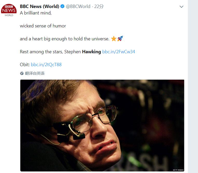 英國廣播公司(BBC)表示,一個(gè)聰明的頭腦,有點(diǎn)“惡趣味”,一個(gè)足矣容納宇宙的心臟。在星辰中安息吧,霍金。