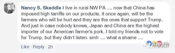 ?。ň幷咦ⅲ何易≡谫e州西北部農(nóng)村…中國準(zhǔn)備對我們的產(chǎn)品加征關(guān)稅,曾支持特朗普的農(nóng)民會再次受傷……我告訴過我的朋友不要給特朗普投票,但他們不聽。哎,太無語了……)