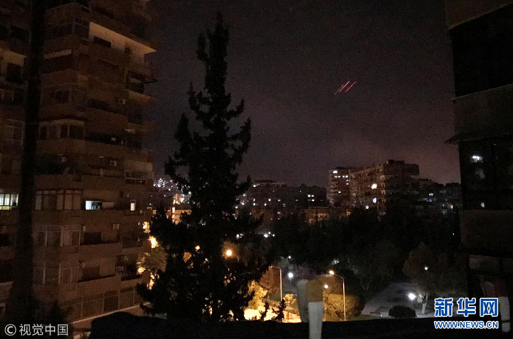 4月14日,敘利亞大馬士革,特朗普決定聯(lián)合英國和法國對敘利亞進行精確打擊,大馬士革傳出爆炸聲,敘利亞方面進行反擊。敘利亞阿拉伯敘利亞通訊社(SANA)報道,敘政府軍在大馬士革以南地區(qū)擊落13枚導彈。敘利亞國家電視臺此前稱美英法三國對敘利亞“發(fā)動了侵略”。(圖片來源:視覺中國)