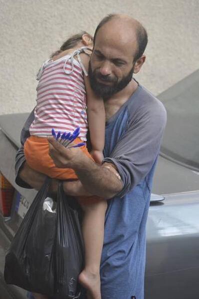滿面愁容的父親,抱著熟睡的女兒