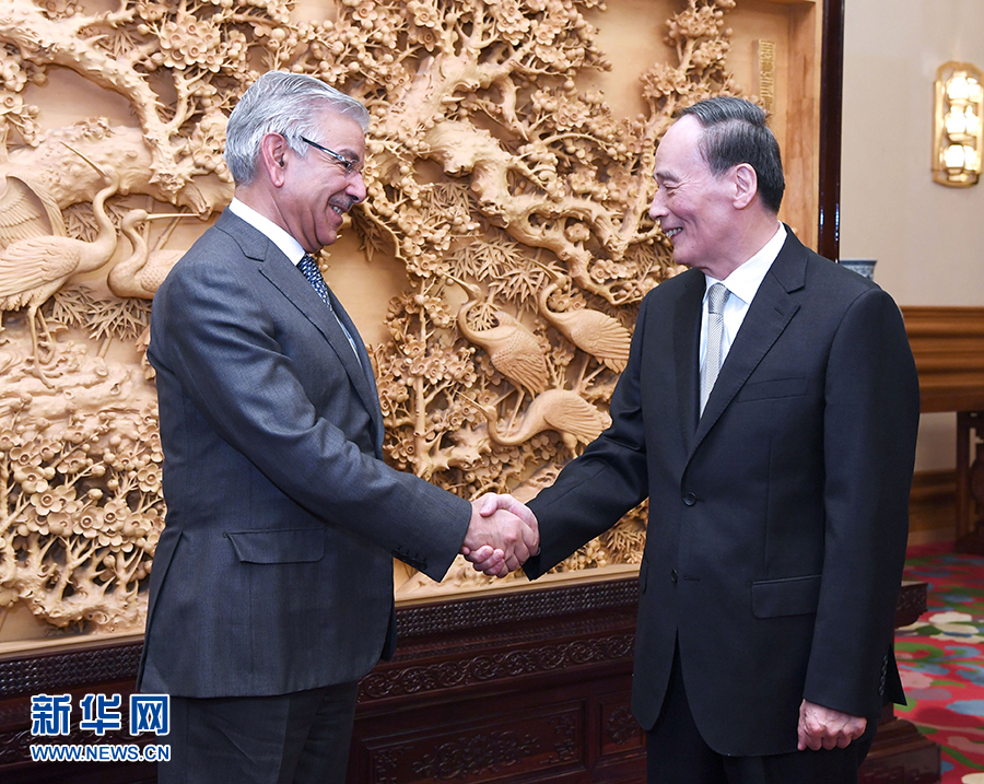 4月24日,國(guó)家副主席王岐山在北京中南海會(huì)見巴基斯坦外長(zhǎng)阿西夫。新華社記者饒愛民攝