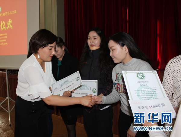 5月11日,蒙古國第六屆大中學(xué)生漢字硬筆書法比賽頒獎儀式現(xiàn)場。新華網(wǎng)發(fā) 意特格樂攝