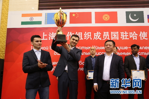 ? 中國(guó)駐哈薩克斯坦大使張漢暉(前排右一)為冠軍獲得者塔吉克斯坦隊(duì)頒發(fā)獎(jiǎng)杯。 新華網(wǎng)發(fā) 阿比洛夫攝