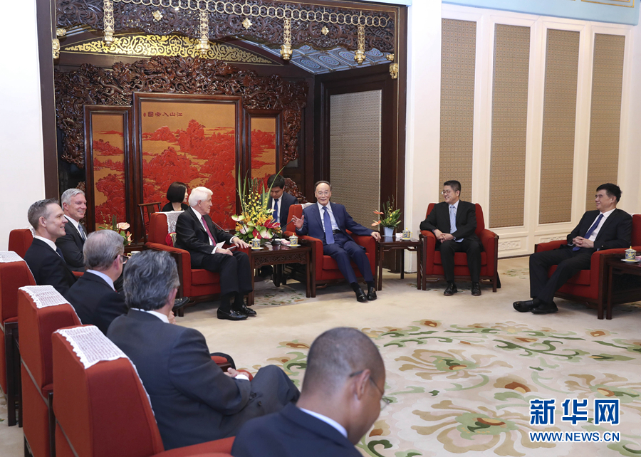 5月15日,國家副主席王岐山在北京中南海會見出席第十輪中美工商領袖和前高官對話的美方代表。 新華社記者 龐興雷 攝