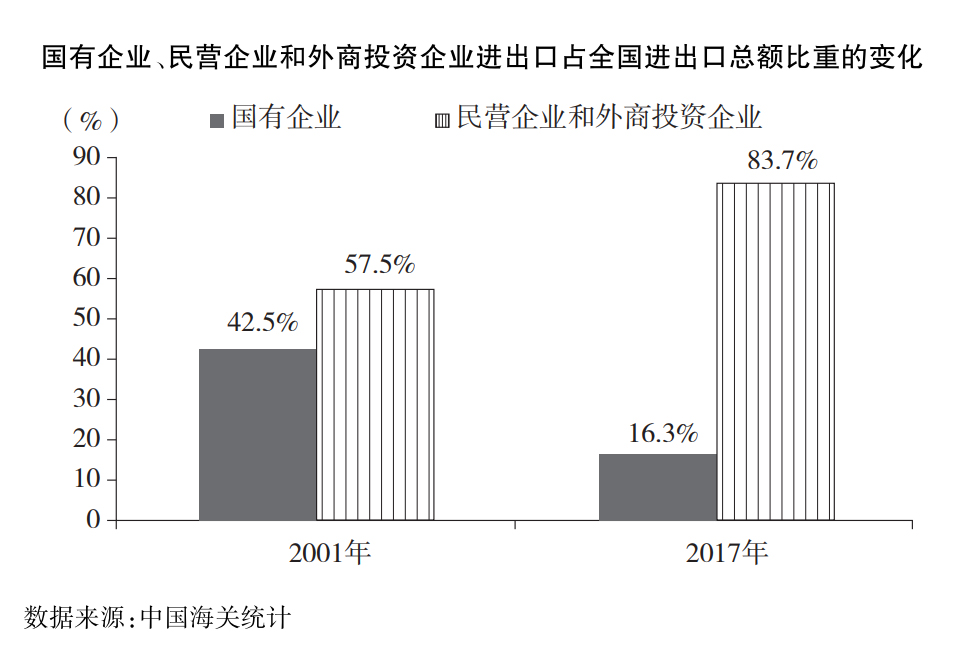 全面放開外貿(mào)經(jīng)營權(quán)。促進(jìn)經(jīng)營主體多元化,激發(fā)各類企業(yè)開展貿(mào)易的積極性。自2004年7月起,中國對(duì)企業(yè)的外貿(mào)經(jīng)營權(quán)由審批制改為備案登記制,極大地釋放了民營企業(yè)的外貿(mào)活力,民營企業(yè)進(jìn)出口發(fā)展迅速,份額持續(xù)擴(kuò)大,成為對(duì)外貿(mào)易的重要經(jīng)營主體。民營企業(yè)和外商投資企業(yè)進(jìn)出口占全國進(jìn)出口總額的比重由2001年的57.5%上升到2017年的83.7%。2017年,作為第一大出口經(jīng)營主體的民營企業(yè)出口占比達(dá)46.6%。