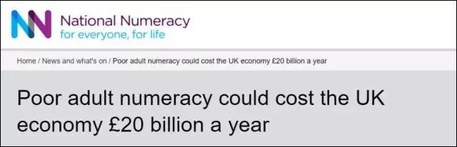 英國國家數(shù)學(xué)能力中心就曾“恨鐵不成鋼”地發(fā)布統(tǒng)計報告稱:英國成年人糟糕的數(shù)學(xué)水平會讓英國每年無意中損失200億英鎊。