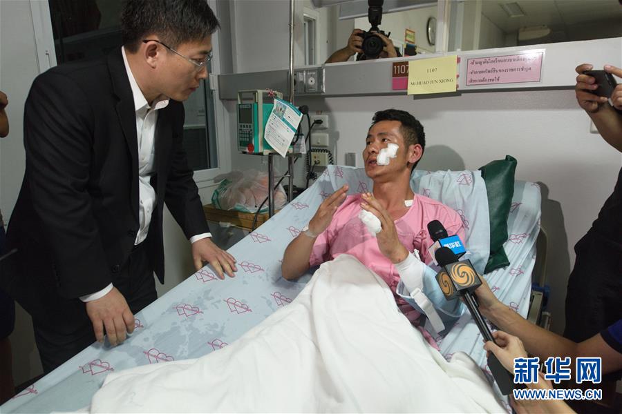 月7日,在泰國普吉,中國駐泰國大使呂?。ㄖ校┪繂柺軅袊慰汀V袊?lián)合工作組7日前往普吉行政醫(yī)院,看望在5日普吉游船傾覆事故中受傷的中國同胞及家屬。2018-07-07 15:25:16