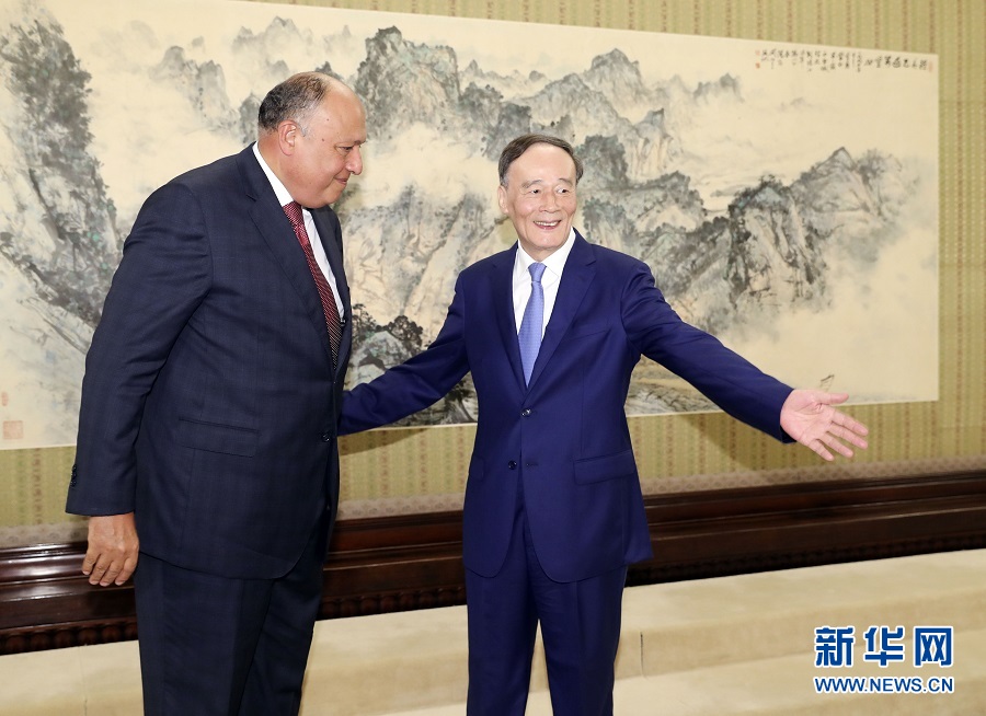7月9日,國家副主席王岐山在北京中南海會見埃及外長舒凱里。 新華社記者 丁林 攝