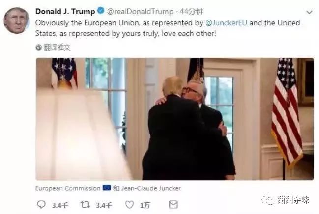 畢竟,到訪美國的歐盟委員會主席容克,不僅得到了美國媒體濃墨重彩的報道,更在特朗普的推特上,將白宮玫瑰園的浪漫延續(xù)了下去——《經(jīng)濟學人》給這次見面取了個唯美貼切的標題:Sealed with a kiss(以吻封緘)。(哈哈哈,莫名覺得這首歐美經(jīng)典情歌用在這里居然有說不出的貼切,《經(jīng)濟學人》取標題的能力也真是要給個大寫的服字!)