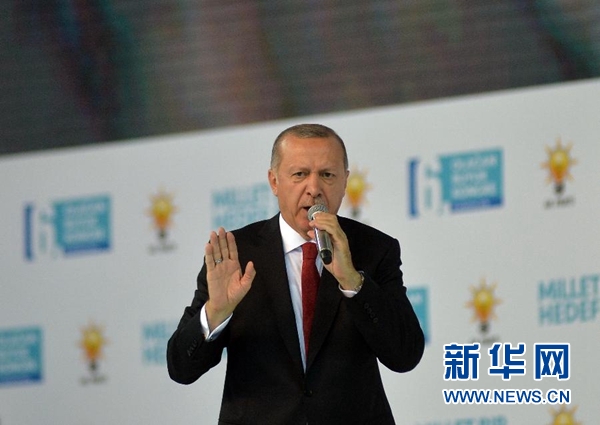 8月18日,在土耳其首都安卡拉,土耳其總統(tǒng)埃爾多安在執(zhí)政黨正義與發(fā)展黨年度大會(huì)上發(fā)表演講。 土耳其總統(tǒng)埃爾多安18日表示,土耳其不會(huì)向經(jīng)濟(jì)威脅屈服。 新華社發(fā)(穆斯塔法·卡亞攝)