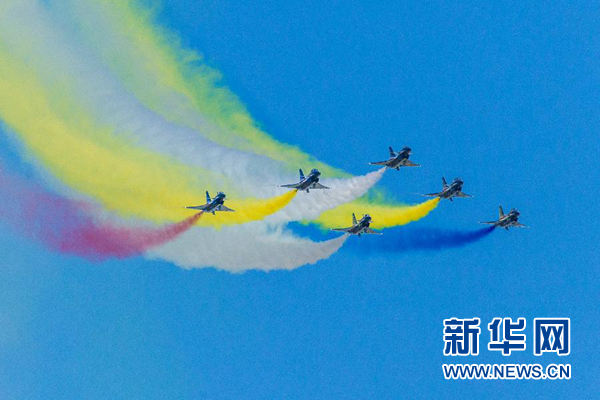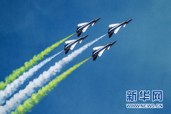 蔚藍(lán)的天空下,八一飛行表演隊成功上演了六機(jī)向下開花、五機(jī)水平向上開花、四機(jī)編隊橫滾、單機(jī)蛇行扭轉(zhuǎn)等21個高難度飛行動作,贏得了現(xiàn)場觀眾陣陣掌聲。