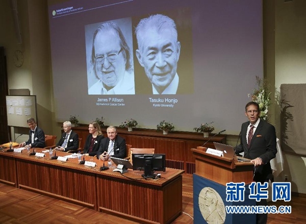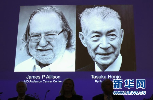 10月1日,在瑞典斯德哥爾摩卡羅琳醫(yī)學(xué)院舉行的新聞發(fā)布會(huì)現(xiàn)場,大屏幕顯示美國科學(xué)家詹姆斯·艾利森(左)和日本科學(xué)家本庶佑的照片。 新華社記者葉平凡攝