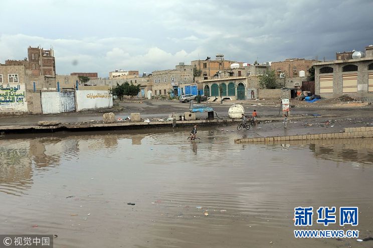 當地時間2018年10月23日,也門薩那,連日暴雨導致街道積水嚴重。(圖片來源:視覺中國)