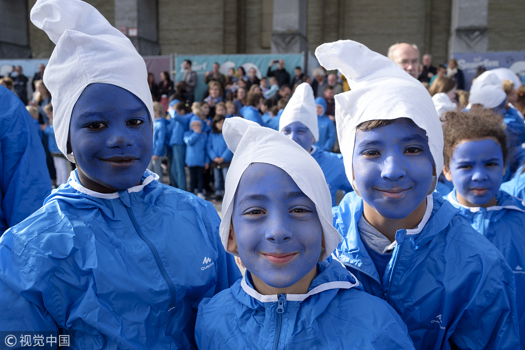 當?shù)貢r間2018年10月23日,比利時布魯塞爾,民眾參加動畫形象“藍精靈”60歲慶祝活動。(圖片來源:視覺中國)