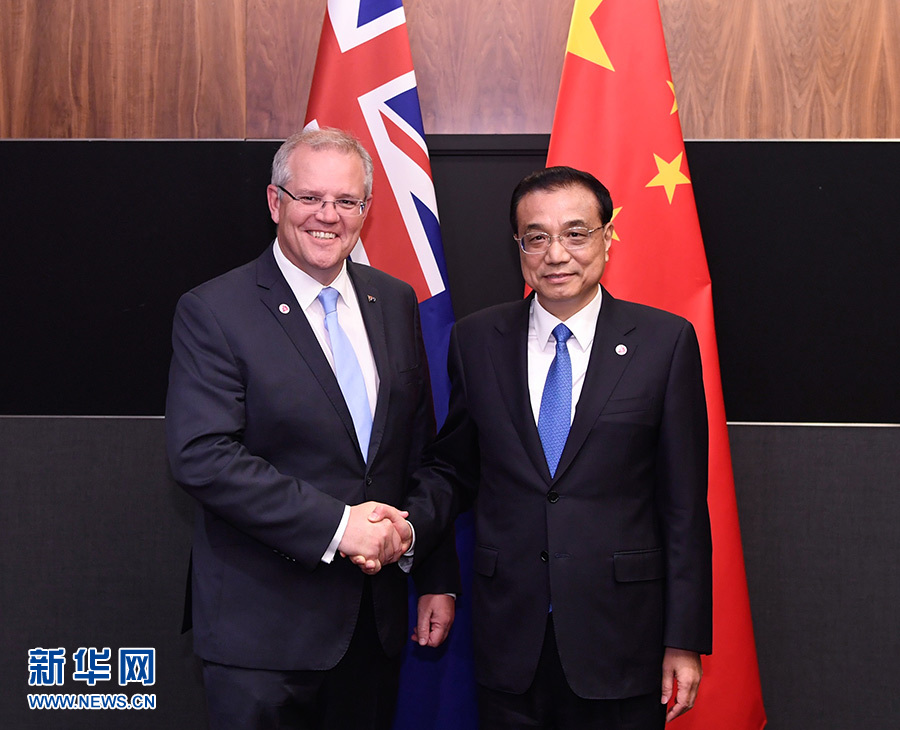 新華社新加坡11月14日電(記者劉天 郜婕)當?shù)貢r間11月14日晚,國務(wù)院總理李克強在新加坡出席東亞合作領(lǐng)導(dǎo)人系列會議期間,同澳大利亞總理莫里森舉行第六輪中澳總理年度會晤。