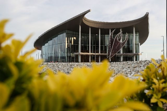 APEC大廈坐落于海濱,是此次APEC會議場館之一。主建筑造型像是巴新土著居民特有的傳統(tǒng)木舟。昔日,土著居民正是駕著這種木舟乘風破浪,開啟周邊貿(mào)易。正門前,12米高的金屬雕塑像木舟極具辨識度的雙帆,又形似巴新國鳥天堂鳥雙翼展向空中,澳大利亞設(shè)計師以此寓意“為開啟繁榮貿(mào)易之旅揚帆”。