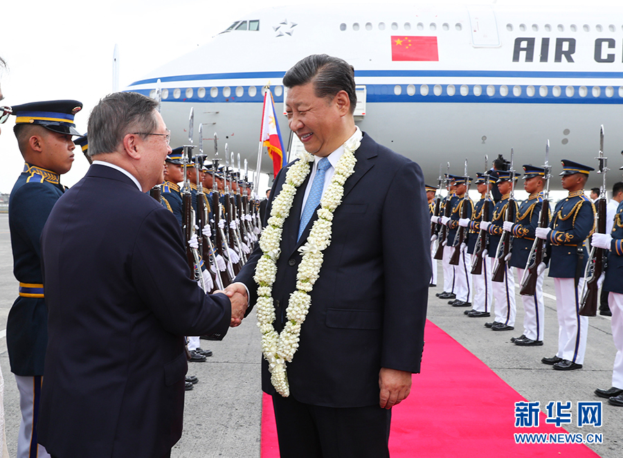 當地時間上午11時45分許,習近平乘坐專機抵達馬尼拉阿基諾國際機場。習近平步出艙門,菲律賓政府高級官員在舷梯旁熱情迎接,軍樂隊奏迎賓曲。禮兵分列紅地毯兩側。菲律賓青年向習近平獻上茉莉花環(huán)。