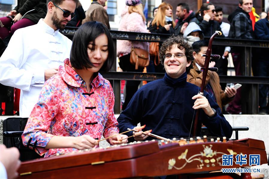 2018年2月11日,在西班牙馬德里,參加弘揚(yáng)中國(guó)傳統(tǒng)文化的“快閃”藝術(shù)表演演員在索菲亞王后博物館前演奏民樂(lè)。新華社記者 郭求達(dá) 攝