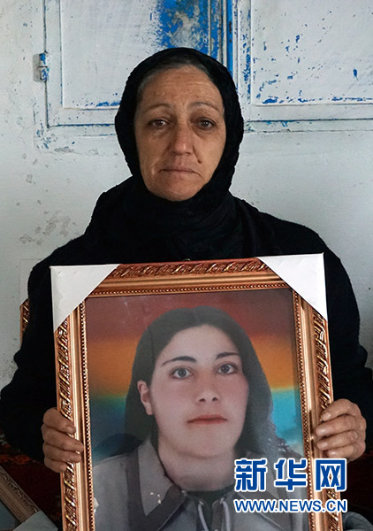 在敘利亞南部蘇韋達省舍比克村,娜赫拉·阿布·阿馬爾手舉遇害親人照片(11月14日攝)。新華社記者 汪健 攝