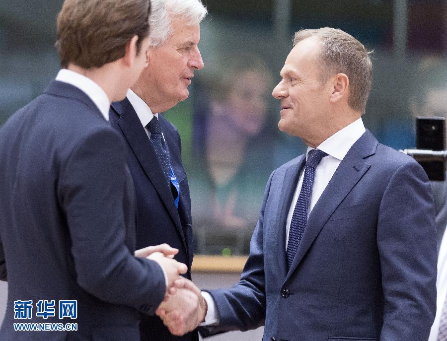 11月25日,在比利時布魯塞爾的歐盟特別峰會會場,歐洲理事會主席圖斯克(右)與歐盟“脫歐”談判首席代表米歇爾·巴尼耶(中)握手。 新華社記者葉平凡攝