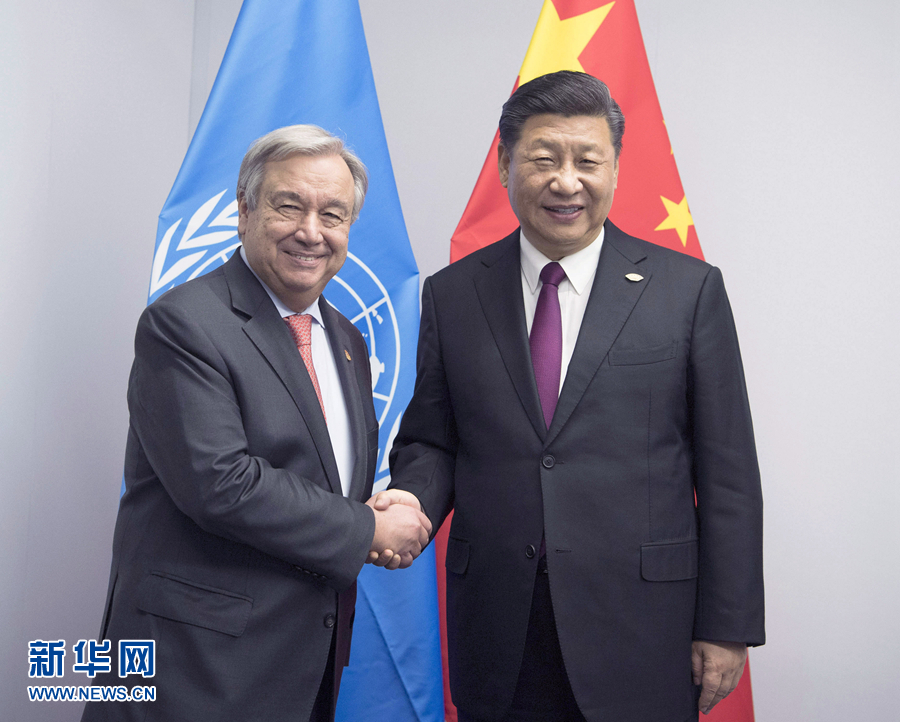 當(dāng)?shù)貢r(shí)間11月30日,國(guó)家主席習(xí)近平在布宜諾斯艾利斯會(huì)見(jiàn)聯(lián)合國(guó)秘書(shū)長(zhǎng)古特雷斯。 新華社記者 李學(xué)仁 攝
