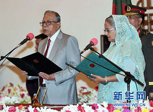 1月7日,在孟加拉國首都達(dá)卡,孟加拉國總統(tǒng)哈米德(左)與總理哈西娜(右)出席新內(nèi)閣宣誓就職儀式。新華社發(fā)