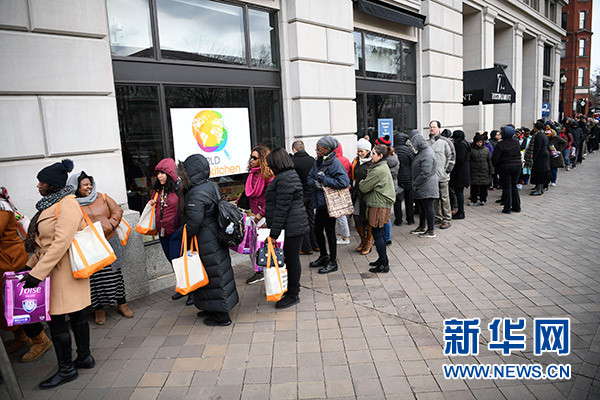 政府“停擺”依舊,冬寒并未遠走,華盛頓哥倫比亞特區(qū)的道路上行人稀少、商戶門廳冷清,但在國家廣場附近一處街角卻見人排起了長隊。