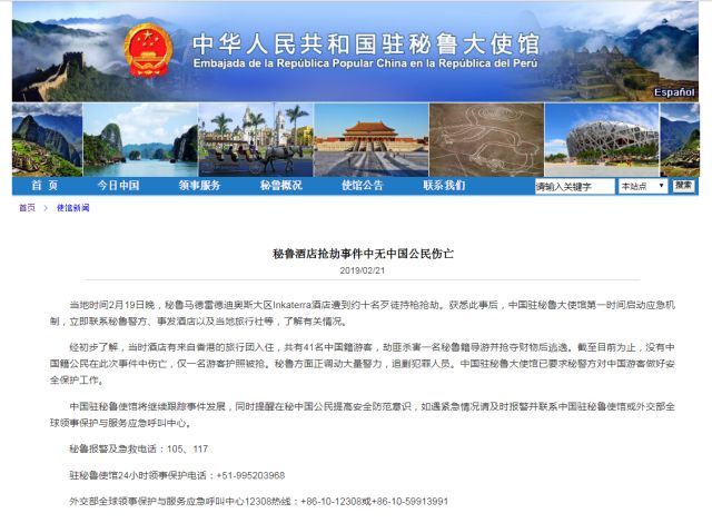 秘魯發(fā)生酒店搶劫事件 大使館通報:無中國公民傷亡