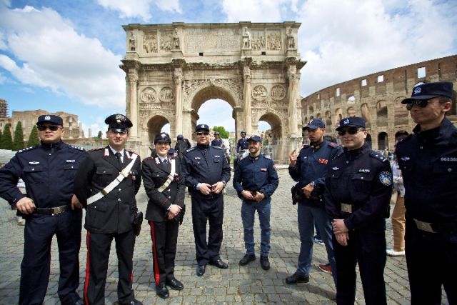 2016年5月2日,中意首次聯(lián)合警務巡邏在意大利羅馬啟動。在意大利羅馬君士坦丁凱旋門外,中方警員與意方警員合影。新華社記者金宇攝