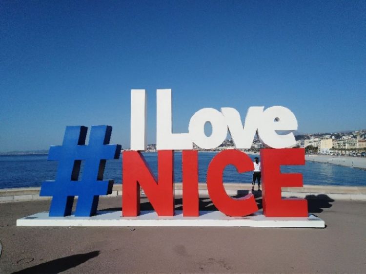 尼斯在恐怖襲擊重創(chuàng)后豎起“我愛尼斯”的標志。2016年7月15日,習近平就尼斯恐襲事件向時任法國總統(tǒng)奧朗德致慰問電。新華社記者 饒愛民 攝