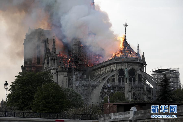 4月15日,在法國巴黎,巴黎圣母院燃起大火。 新華社發(fā)(亞歷山大·卡曼 攝)