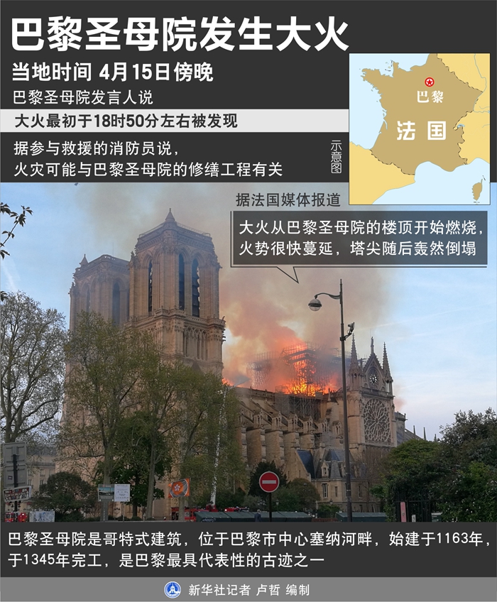 據(jù)法國媒體報(bào)道,大火從巴黎圣母院的樓頂開始燃燒,火勢(shì)很快蔓延,熊熊火焰從教堂兩座鐘樓間竄出,塔尖隨后轟然倒塌。據(jù)參與救援的消防員說,火災(zāi)可能與巴黎圣母院的修繕工程有關(guān)。