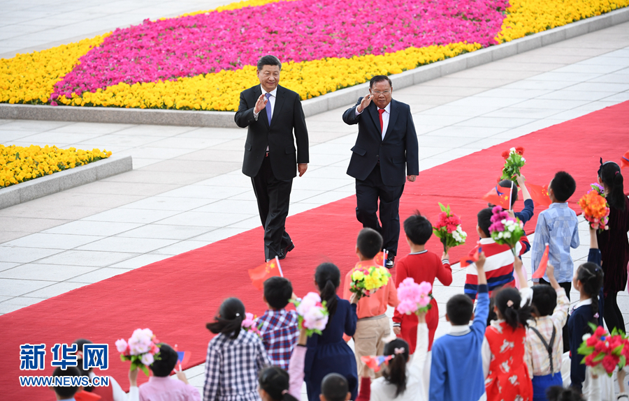 4月30日,中共中央總書記、國家主席習近平在北京同老撾人民革命黨中央總書記、國家主席本揚舉行會談。這是會談前,習近平在人民大會堂東門外廣場為本揚舉行歡迎儀式。 新華社記者 饒愛民 攝