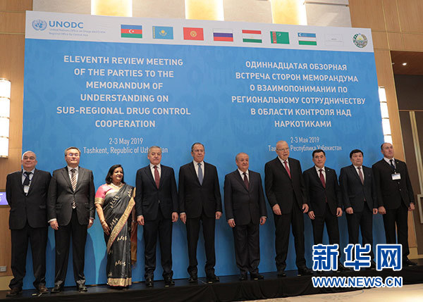 5月3日,在烏茲別克斯坦首都塔什干,來自哈薩克斯坦、吉爾吉斯斯坦、塔吉克斯坦、土庫(kù)曼斯坦、烏茲別克斯坦、俄羅斯、阿塞拜疆以及聯(lián)合國(guó)毒品和犯罪問題辦公室等的代表會(huì)前合影。新華社記者 蔡國(guó)棟 攝