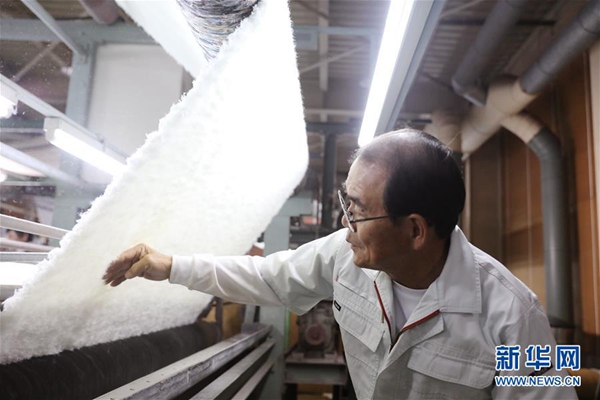 這是5月17日在日本和歌山縣,岡田織物現(xiàn)任社長(zhǎng)岡田次弘挑選人造毛皮產(chǎn)品。新華社記者 杜瀟逸 攝