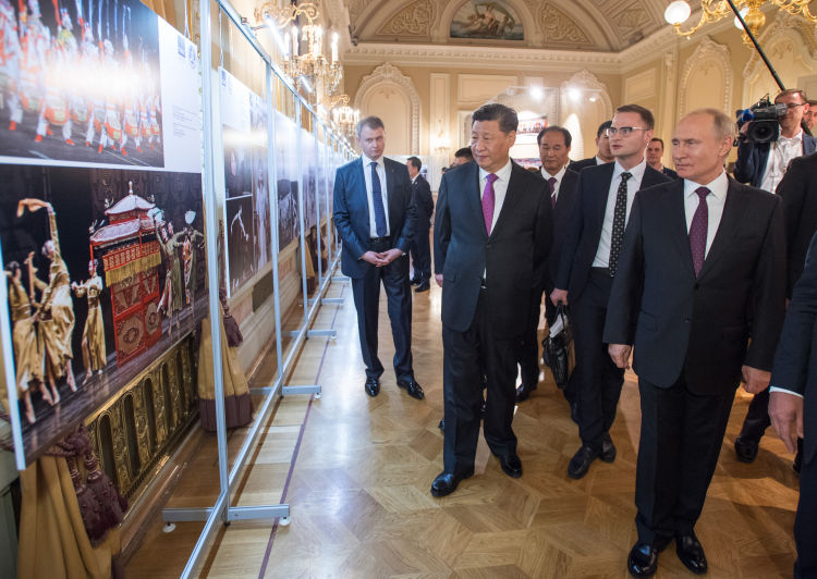6月5日,國家主席習(xí)近平和俄羅斯總統(tǒng)普京在莫斯科大劇院共同出席中俄建交70周年紀(jì)念活動(dòng)。這是兩國元首共同參觀中俄建交70周年圖片展。新華社記者李學(xué)仁攝