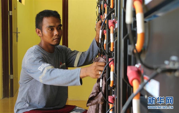 6月6日,在菲律賓北部偏遠(yuǎn)山區(qū)的巴利瓦特村,村民迪奧內(nèi)斯托·埃斯特萬(wàn)在太陽(yáng)能發(fā)電站進(jìn)行電力設(shè)備日常檢查和維護(hù)。新華社記者 鄭昕 攝