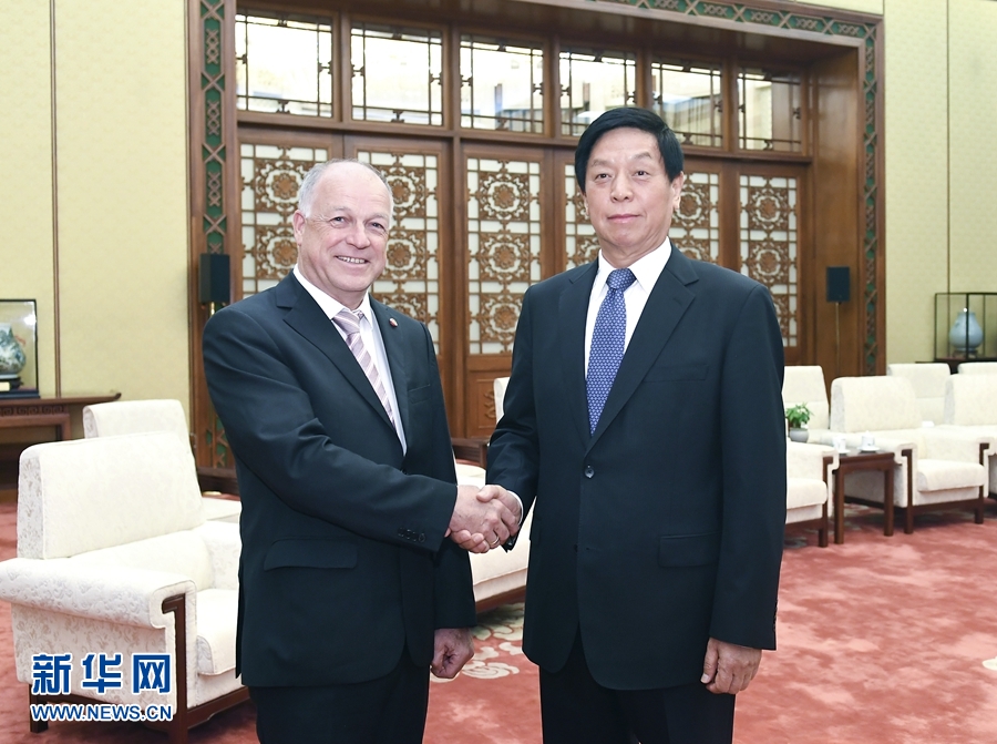 6月10日,全國(guó)人大常委會(huì)委員長(zhǎng)栗戰(zhàn)書在北京會(huì)見以?shī)W地利聯(lián)邦議會(huì)議長(zhǎng)英戈·阿佩為團(tuán)長(zhǎng)的奧中友協(xié)高級(jí)代表團(tuán)。 新華社記者 燕雁 攝